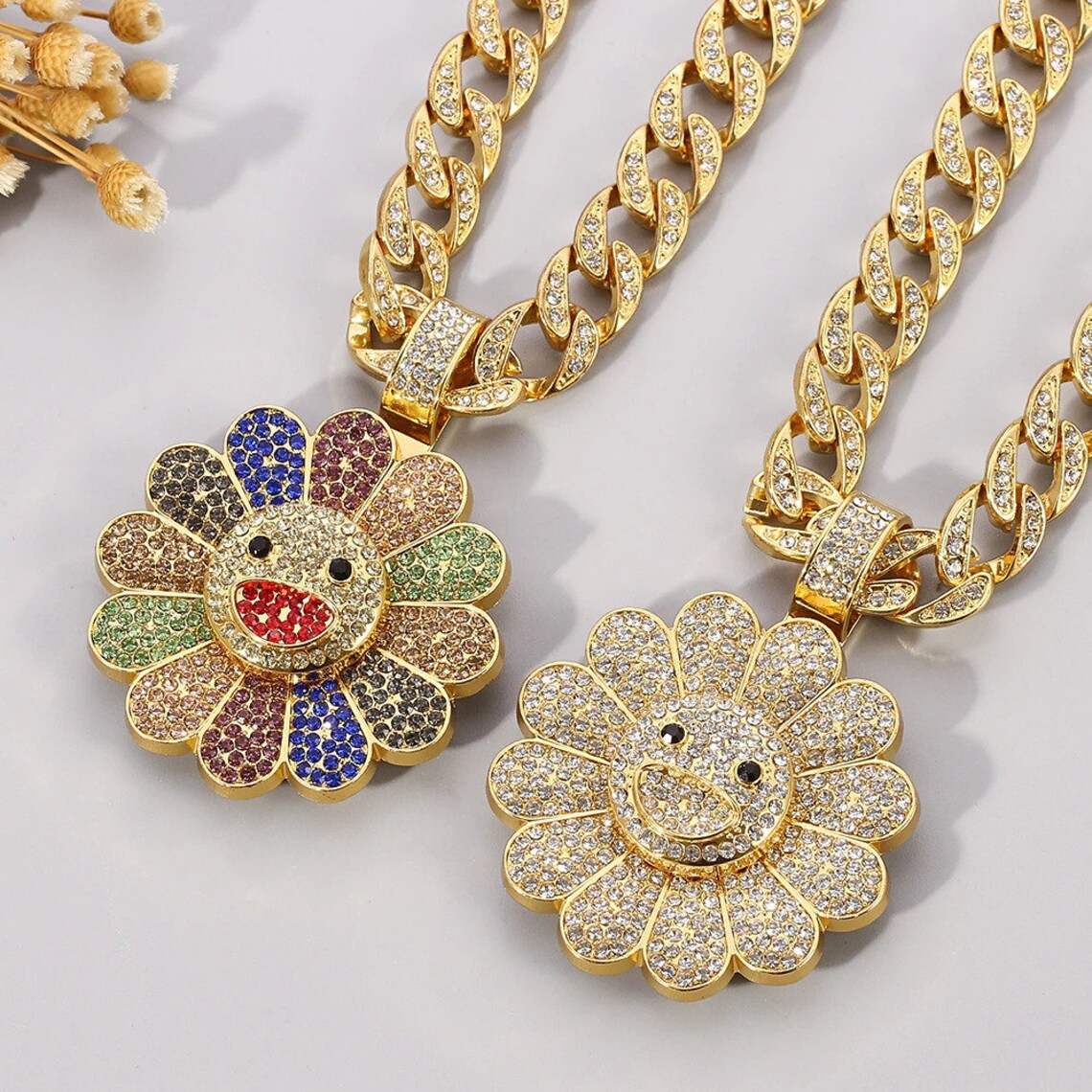 Sunflower Crystal Rotatable Iced Out Cuban Chain Hip-hop Necklace