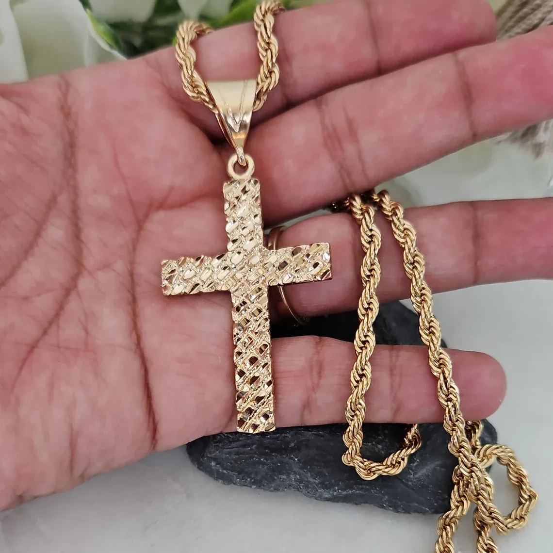 Gold Plated Diamond Cut Cross Pendant Rope Chain Cross Necklace