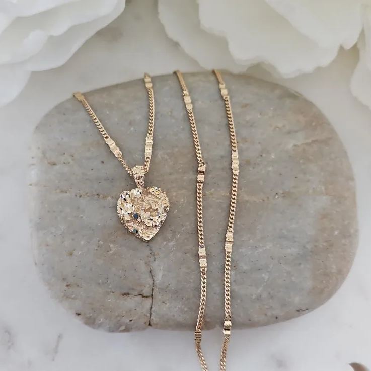 Gold Plated Nugget Necklace Diamond Cut Charm Heart Necklace