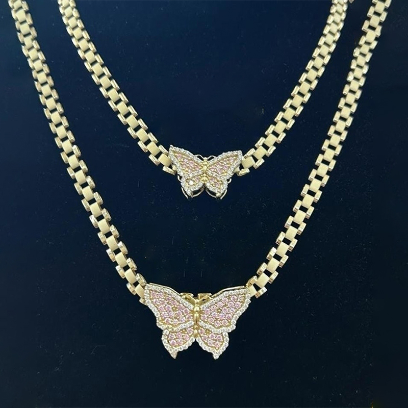 Pink Butterfly RX Chain Watch Band Necklace Gold Plated Classic Necklace 12mm Width