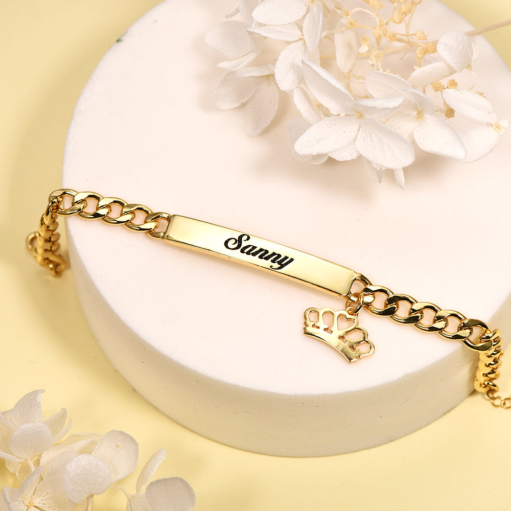 Gold Plated Personalized Cuban Chain Engraved Name Bar Bracelet with Crown Pendant