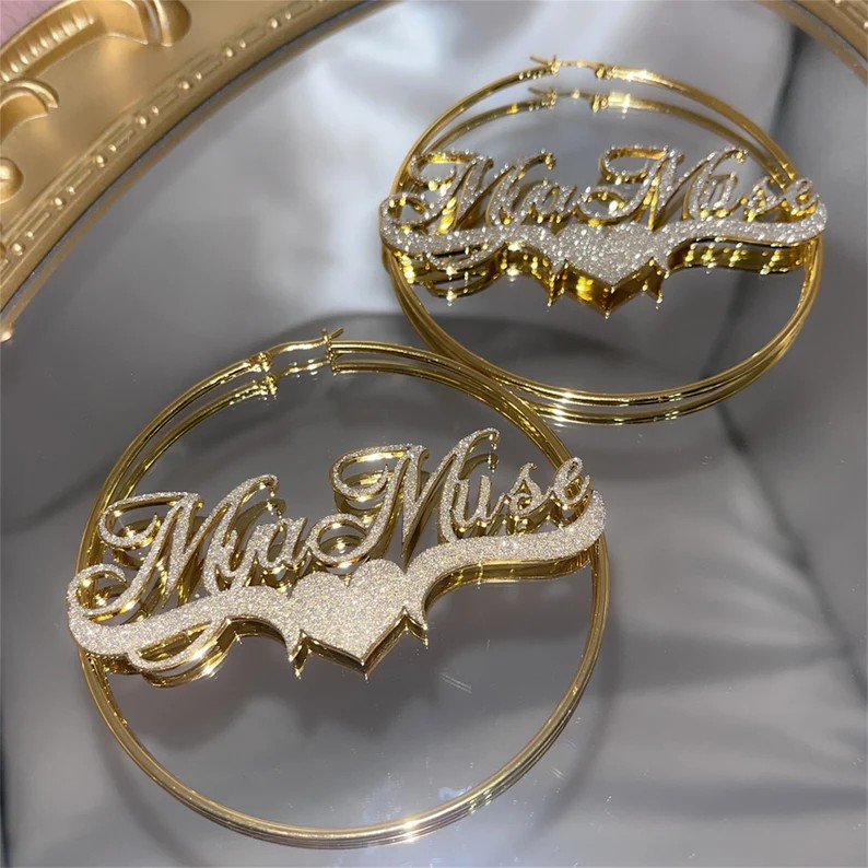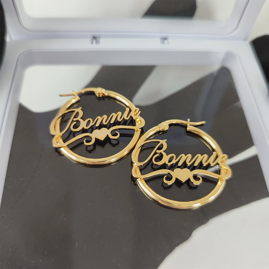 Bling Bling Hoop Earrings with Heart Personalized Gold Plated Name Earrings