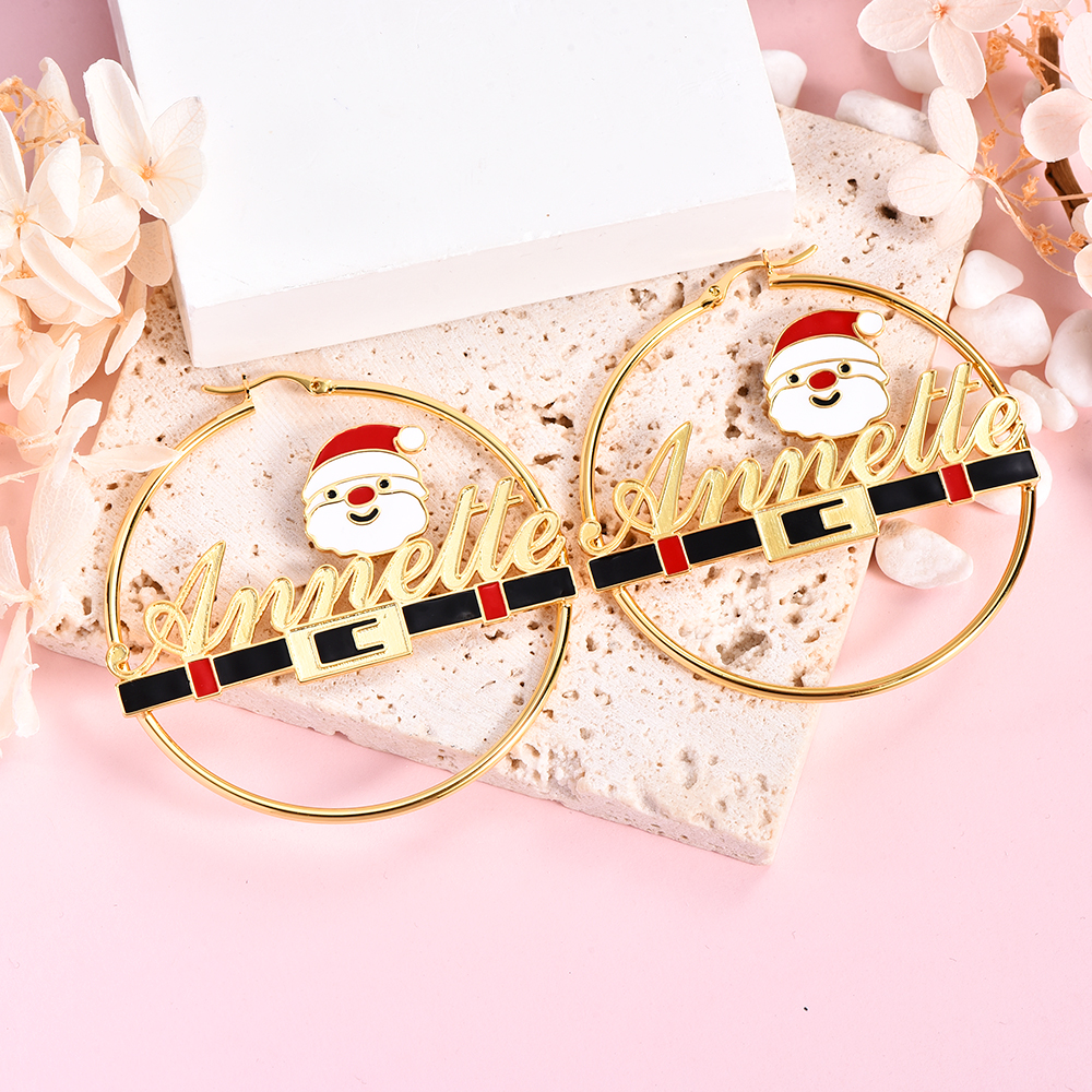 Cartoon Christmas Father Santa Nameplate Hoop Earrings Gold Plated Name Earrings