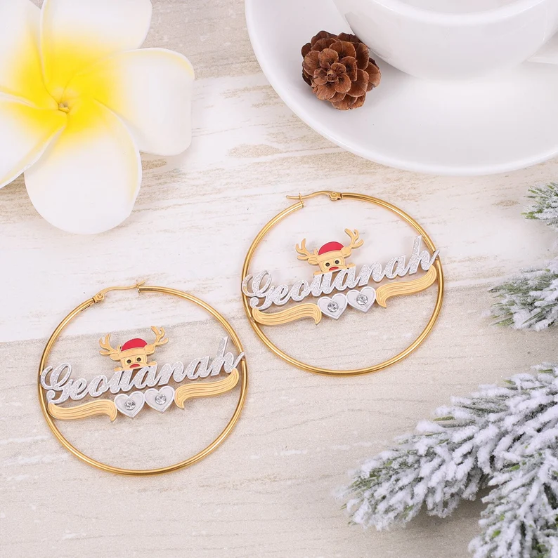 Christmas Red Nose Reindeer Nameplate Hoop Earrings with Two Hearts Two Tone Personalized Custom Name Earrings