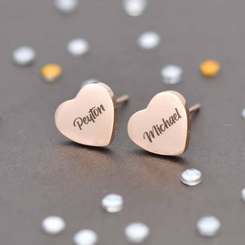 Heart Rose Gold Stud Earrings Personalized Custom Engraved Name Earrings