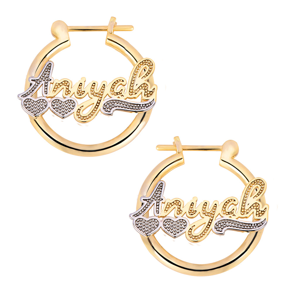 Gold Plated Hoop Personalized Name Earrings With Two Heart