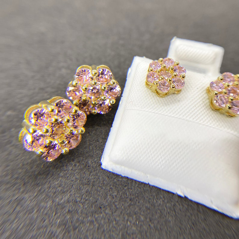 Gold Flower CZ Pink Hexagon Stud Earrings Gold Plated Diamond Cut Earrings