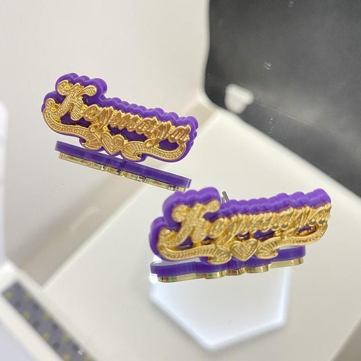 Purple Acrylic with Heart Double Plate Personalized Custom Gold Plated Name Stud Earrings Gift For Her
