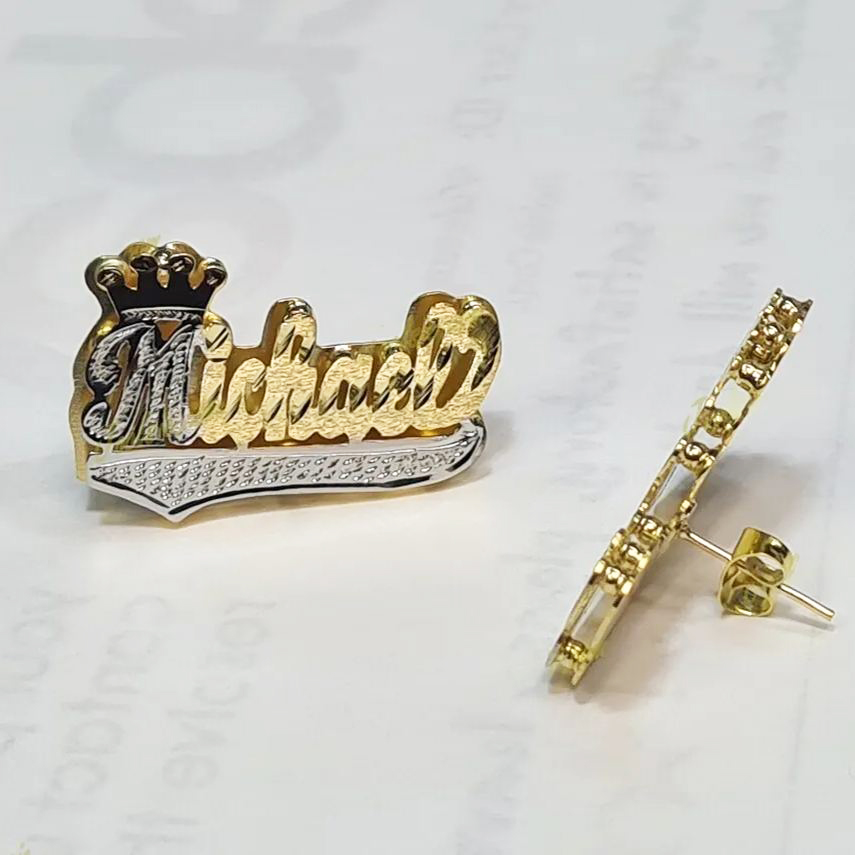 Crown Double Plate Tow Tone Personalized Custom Name Stud Earrings