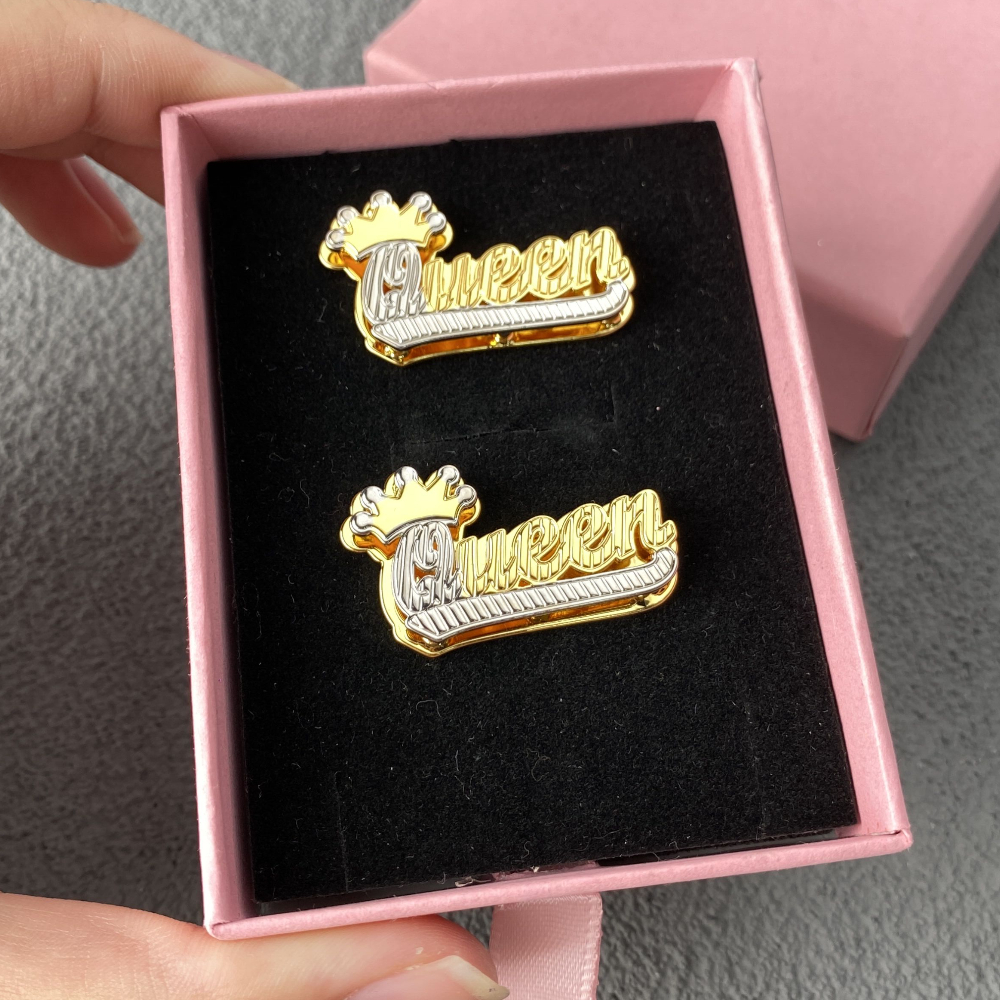 Double Layer Two Tone Crown and Underline Custom Name Stud Earrings