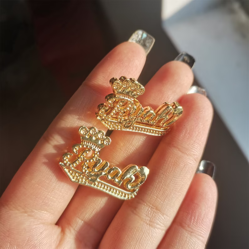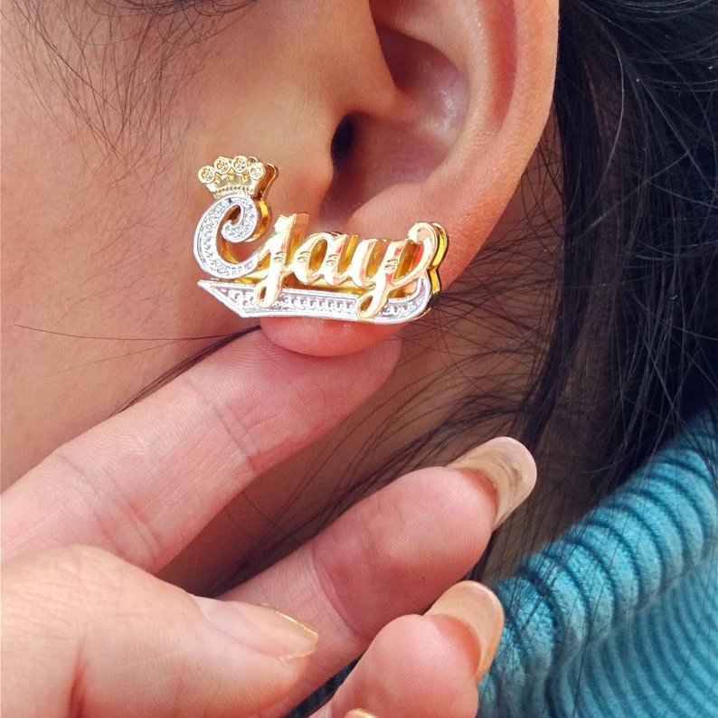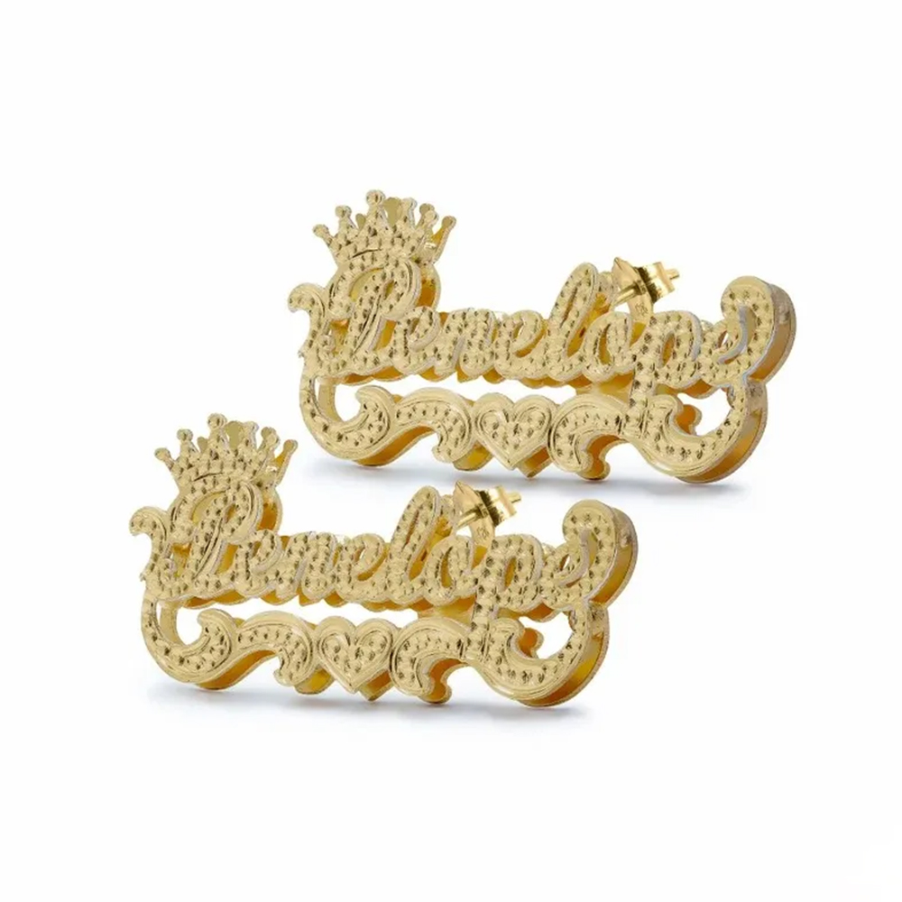 Double Layer Crown Nameplate Personalized Custom Gold Plated Name Stud Earrings